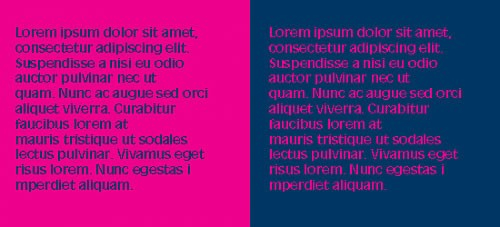有些色彩组合只适合运用在前景色的部分,而不适合做背景色。举个例子来说,深蓝色的文字搭配粉红色的背景与粉红色的文字搭配深蓝色的背景,都是使用两种一样的颜色,但用在不同的部分则影响了它的可读性和阅读的舒适度。重要的是,不仅要使用良好的色彩组合,而且要把它用在页面中的合适元素上。